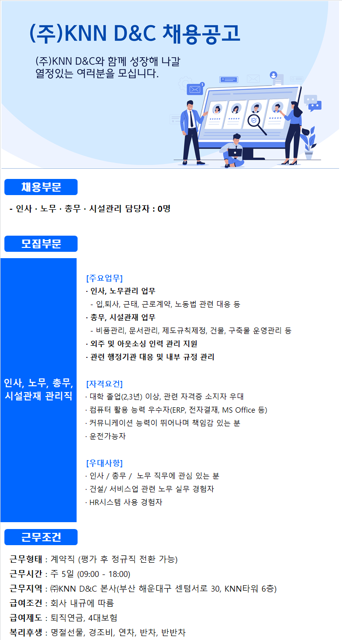 | ▶ 모집부문 인사 · 노무 · 총무 · 시설관리 담당자 채용인원 : 0명 ▶ 담당업무 인사·노무관리 (입·퇴사 관리, 근태관리, 근로계약 등 기본 인사 업무 지원) 총무·시설관리 (비품관리, 문서관리, 사내 환경 관리 지원) 외주 및 아웃소싱 인력 관리 보조 행정업무 및 사내 운영 지원 ★ 신입의 경우, 단계적으로 업무를 배우며 수행합니다 ▶ 자격요건 전문대(2·3년) 이상 졸업자 (예정자 가능) MS Office 및 기본 전산 활용 가능자 성실하고 책임감 있는 분 원활한 커뮤니케이션 능력을 갖춘 분 ▶ 우대사항 인사 / 총무 / 노무 직무에 관심 있는 분 관련 전공자 (경영, 행정 등) ERP 및 HR 시스템 경험자 (우대, 필수 아님) 운전 가능자 ▶ 근무조건 근무형태 : 계약직 (평가 후 정규직 전환 가능) 근무시간 : 주 5일 (09:00 ~ 18:00) 근무지역 : 부산 해운대구 센텀서로 30, KNN타워 6층 ▶ 급여조건 회사 내규에 따름 ▶ 복리후생 4대보험, 퇴직연금 명절선물, 경조비 지원 연차 / 반차 / 반반차 제도 ▶ 지원방법 이력서 및 자기소개서 이메일 제출 (자유양식) E-mail : knn_dnc@naver.com 사람인, 잡코리아 채용사이트 지원 |